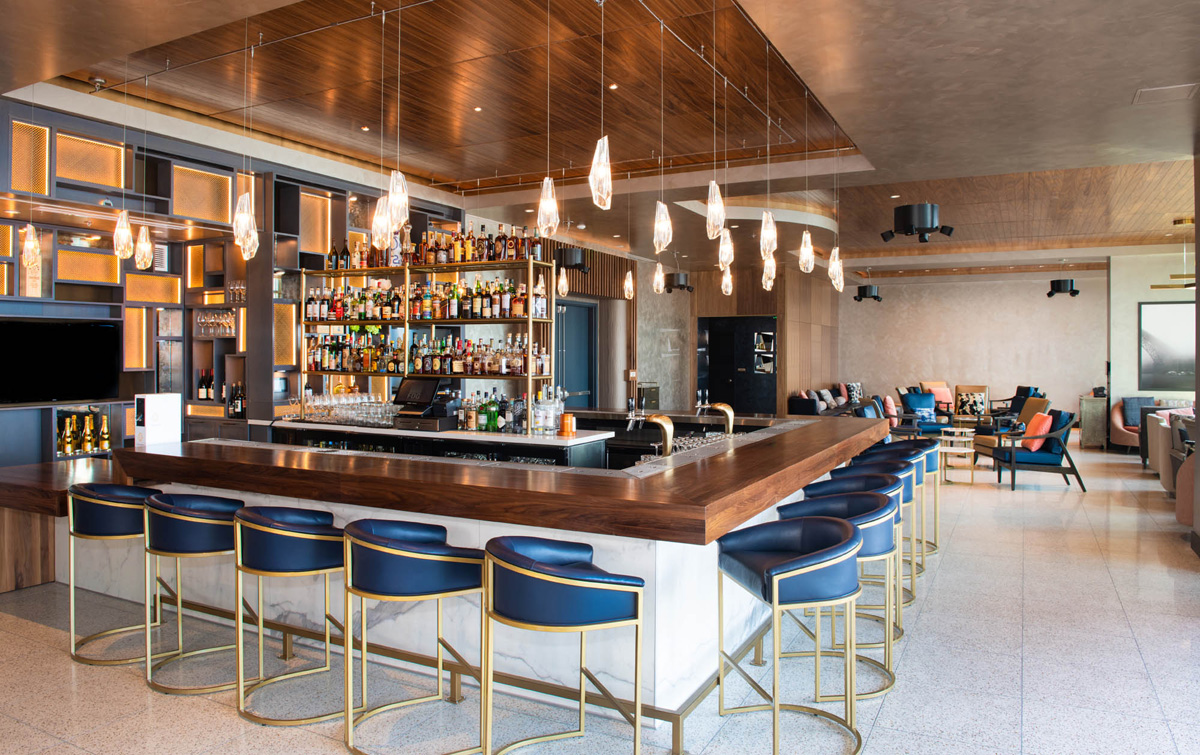 A modern bar with a wooden counter, numerous bottles on shelves, blue chairs, hanging lights, and an adjacent lounge area with sofas.