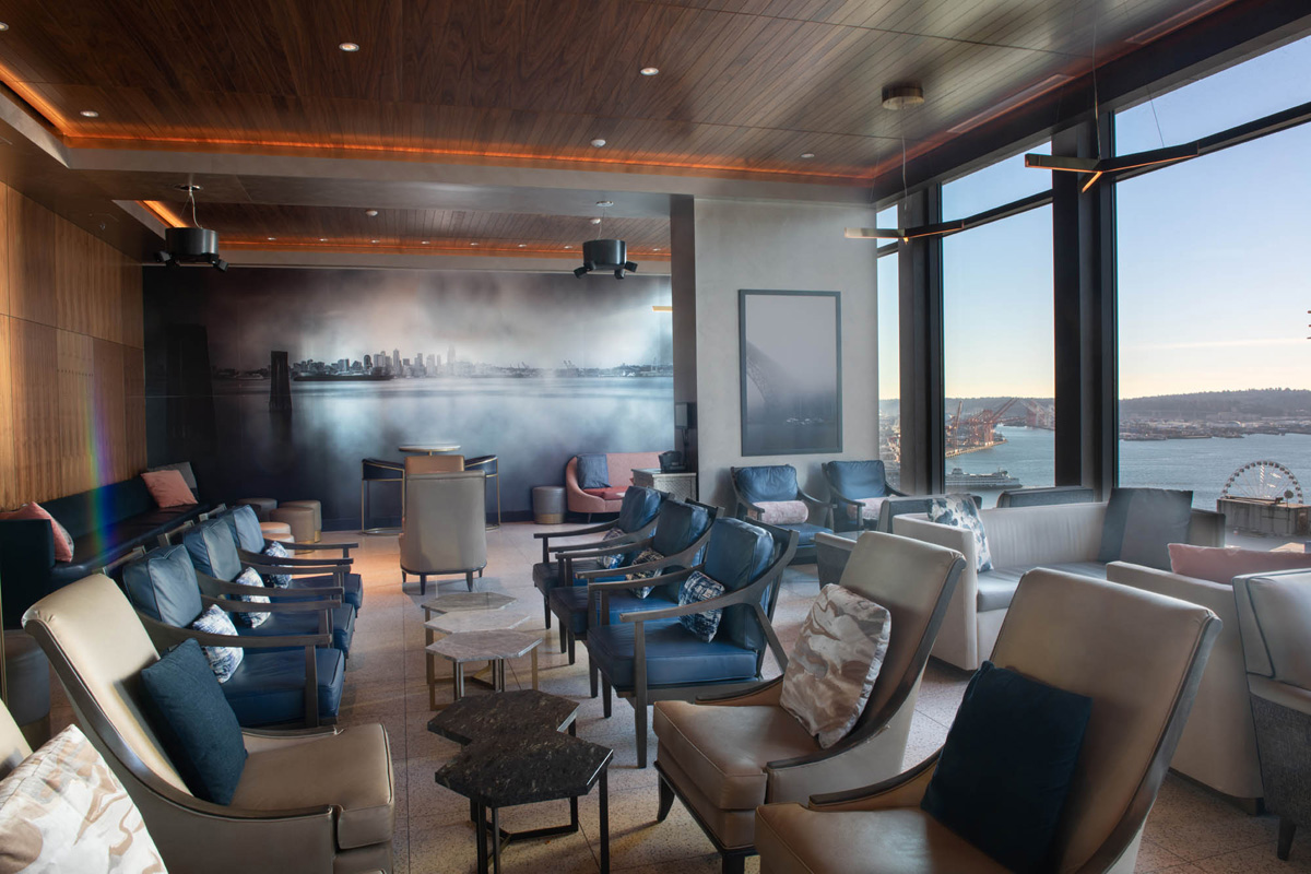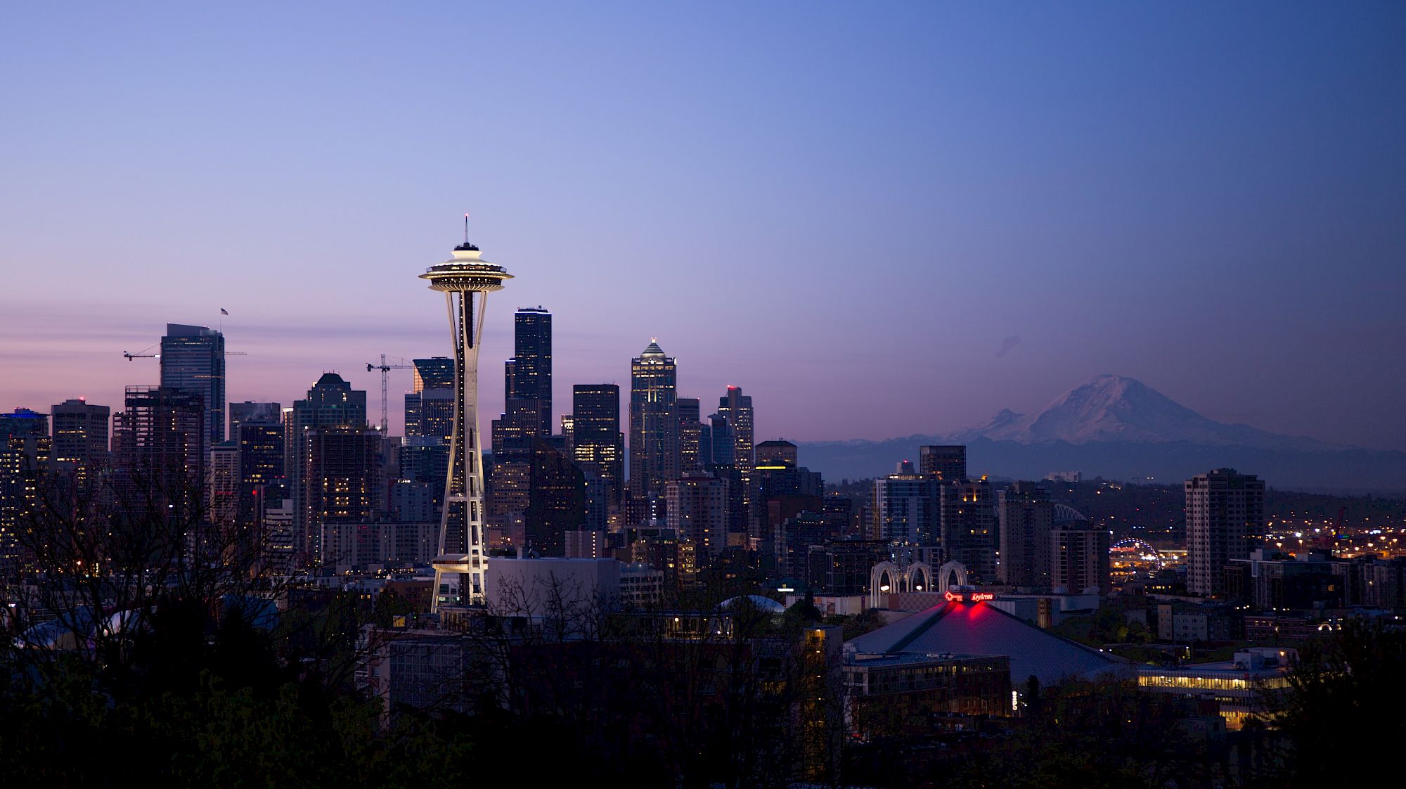 This image shows the Seattle skyline at twilight, featuring the iconic Space Needle and Mount Rainier in the background.